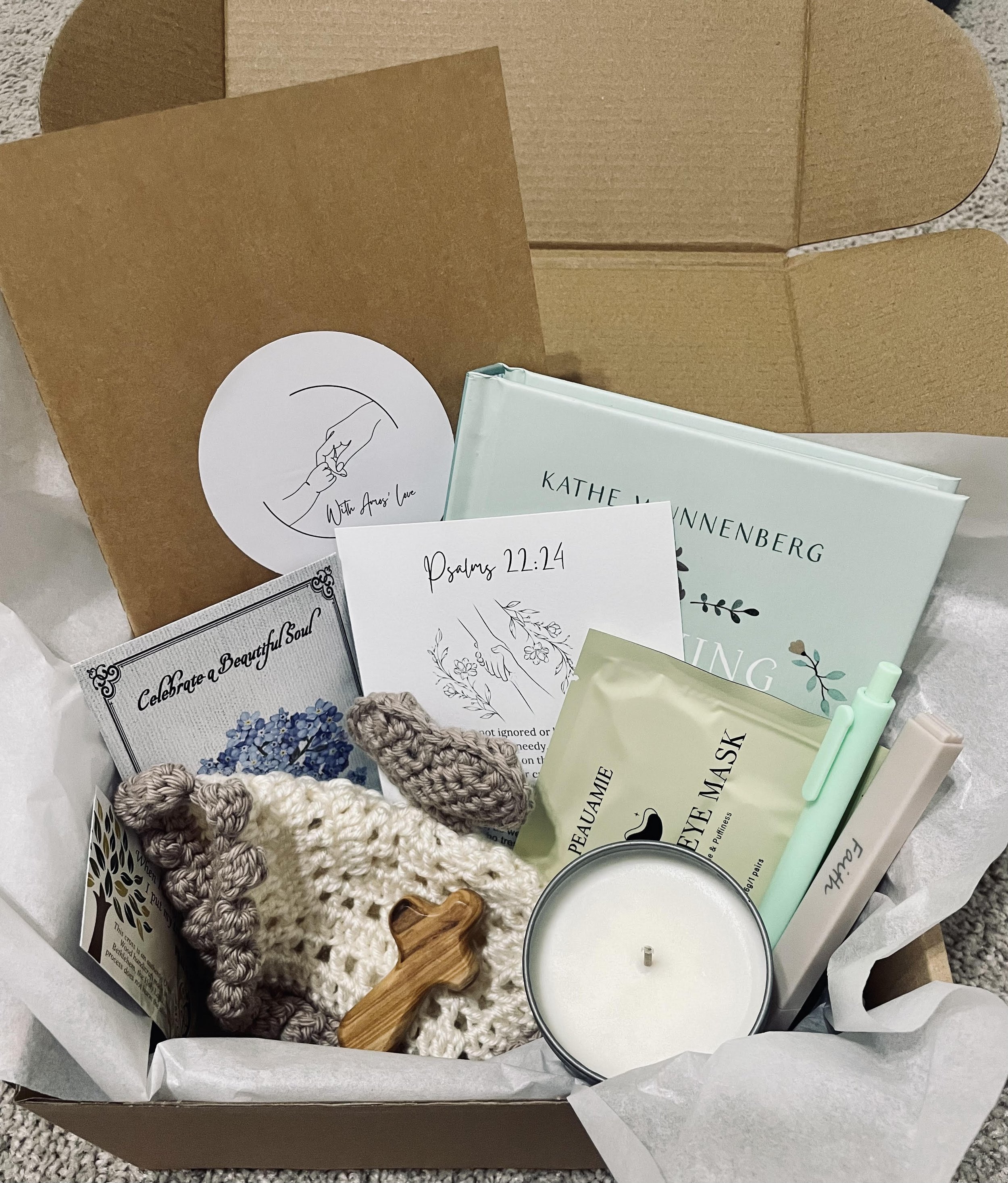 Our boxes contain many items that are donor-based and are made to support a mother during her time of grief and share the hope of Jesus Christ during a time of loss. Each box contains a devotional, journal, pen, highlighter, handmade gift, pocket cross made from Olive trees in Bethlehem, Forget Me Not seeds, handmade candle, scripture card, and a handwritten note.